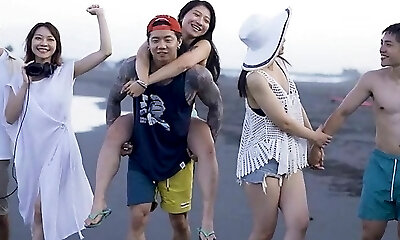 Group of insatiable Japanese folks throw a wild group sex fuckfest at the beach