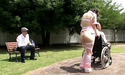 Subtitled bizarre Japanese half bare caregiver outdoors