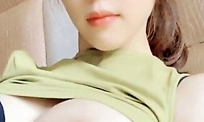 Sweet Asian cute brunette on the couch taunts herself with unholy sex toys